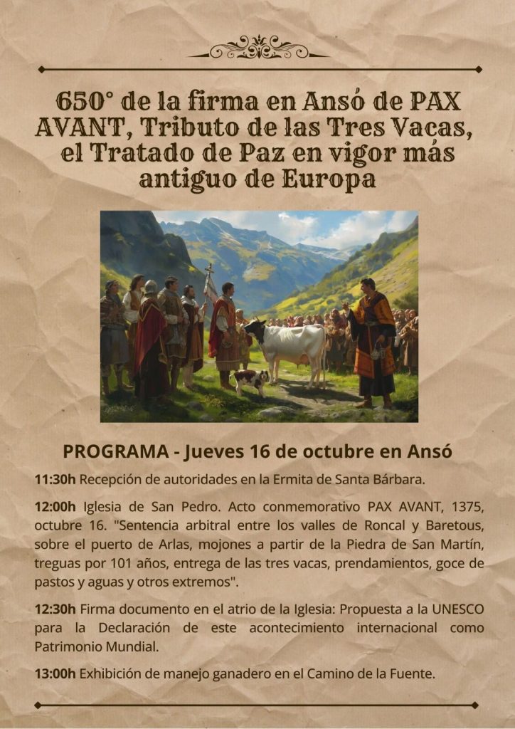 Hace 650 años roncaleses y baretones sellaron un acuerdo con la mediación de Ansó. El Tributo de las Tres Vacas demuestra que con la palabra, la paz es posible. El 16 de octubre de 1375, seis hombres buenos de Ansó, con el alcalde Sancho Gracia a la cabeza, dictaban sentencia en el atrio de la […]